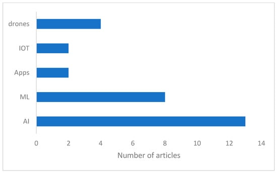 From the bibliometric analysis, it is evident that the majority of articles considering the use of ICTs and agricultural digitization from an environmental perspective are related to the employment of artificial intelligence (AI) with thirteen articles, followed by machine learning (ML) with eight articles. Articles that discuss the use of drones follow with four articles, and finally, the least reported categories are mobile apps and the Internet of Things (IoT), each with two articles, as depicted in Figure 2.
