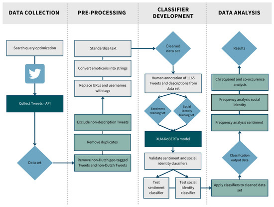 To gain this understanding, this paper employs three sub-objectives with corresponding research questions. First, it seeks to evaluate public opinion via sentiment orientation and target analysis, specifically on the envisioned green-energy mix technologies in the Netherlands, including solar, wind, biomass, geothermal, hydrogen, hydropower, and nuclear energy, using Twitter data, thus, utilizing the sub question ‘How is sentiment expressed towards green-energy technologies within the Dutch Twitter discourse?’ Twitter, a microblogging platform, is opted for as the primary data source for this study due to its rich repository of user-generated content, which is particularly abundant with respect to socio-political discourse [21]. This characteristic renders Twitter a valuable resource for researchers to tap into a crowd-sourced pool of sentiments embedded within public opinion toward green-energy technologies [21]. The second goal of this study is to comprehend opinion holders through their social identity expressions, using Twitter profile description data from the Netherlands. In pursuit of this goal, the following sub question is posed: ‘How are social identity categories expressed among Dutch Twitter users within green-energy technology Twitter discourse?’ This is opted for as Twitter allows users to create profile descriptions, which are frequently used to represent online social identities [20,22,23]. This means that Twitter generates extensive data about individuals’ social identities, which can be used for identity analyses embedded within the energy discourse without direct interference. The paper’s final goal is to determine how the sentiment components of public opinion, towards green-energy technologies, vary across social identity expressions among Dutch Twitter users, employing the sub question ‘How does sentiment regarding green-energy technology types vary among social identity categories among Dutch Twitter users?’ This will allow for a better understanding of how individuals’ social identity relates to expressed opinions within energy technology discourse and to enhance acceptance practices with the potential of being more inclusive.