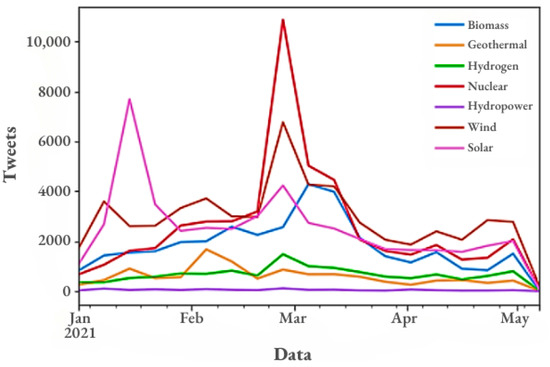 During the Dutch House of Representatives elections in March 2021, green-energy technologies gained considerable attention, becoming focal points of discussion as they were assessed as potential solutions to meet the government’s target of generating 27% sustainable energy by 2030 [24]. Specifically, solar, wind, biomass, nuclear, the more emerging technologies of geothermal and hydrogen energy, and hydropower to some extent, were discussed on a grand scale [25,26]. The potential integrations of these green-energy technologies within current energy systems may have profound implications on societies’ economic, political, and social systems, meaning that the topic often prompts public response [27]. The opinions shared by the public in response represent a multitude of perspectives and are usually quite complex to grasp [27]. Thoroughly understanding these opinions is crucial for both researchers and policymakers, given that public opinion can shape, or even hinder and halt, the acceptance and deployment of green energy technologies [28]. Consequently, scholars have called for the establishment of a concrete, yet nuanced, comprehension of public opinion, as this would aid in developing more meaningful acceptance initiatives, as well as expanding the comprehension of potential policy obstacles [14,29,30]. Past research has focused on understanding public opinion on green-energy technologies by analyzing the public discourse, which encompasses the exchange and deliberation of viewpoints and opinions among individuals within the wider public dialogue [29,31,32,33]. The emergence of digital media, particularly social media platforms, has ushered in a new era of public opinion and discourse research [5,34]. These platforms have offered individuals unparalleled opportunities to express themselves and participate in discussions [35,36], which has led to a more diverse and dynamic public conversation, allowing a wide range of opinions, including on socio-political matters, to be freely expressed and debated [21]. Twitter in particular has become a crucial platform for socio-political deliberation [18,37], particularly on topics of general interest such as climate change [38], sustainability [39], and energy systems [14]. This has resulted in Twitter serving as a space where socio-political public opinions, including those related to green-energy technologies, are discussed, and partially reflected [14,18]. Utilizing the Twitter discourse to study public opinions has been shown to be particularly advantageous surrounding the opinion component of sentiment [40,41].