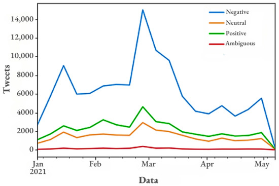 As is shown in Figure 3, while following the general curve of the tweets put out in the time frame, the sentiment of the tweets collected is negative (117,793 tweets) above all. In the peaks, while more tweets are put out, the difference between the amounts of negative sentiment and the other sentiments becomes larger. Meaning that during those peak times relatively more negative tweets are tweeted when compared to positive, neutral, and ambiguous tweets. From the remaining three sentiments positive tweets (40,266 tweets) are most frequent, followed by neutral tweets (26,552 tweets). Few ambiguous tweets (2211 tweets) are detected.