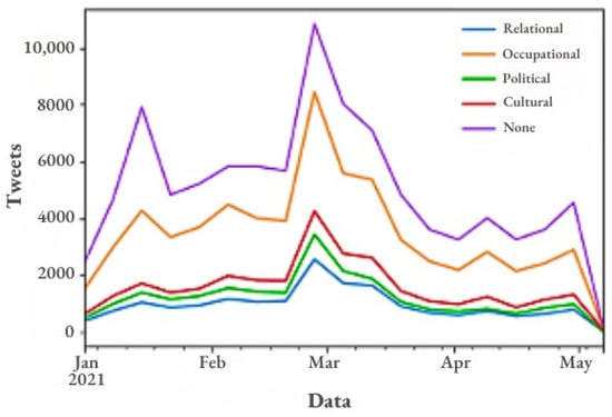 Over the course of January through March, the number of Twitter profiles tweeting about energy technologies logically follows the general curve of tweets posted during that time frame, as depicted in Figure 4. It is apparent that in the classification of social identity, the model most often did not identify any of the distinct identity categories (95,677 profiles). However, when the identity categories were recognized, the occupational classification (66,009 profiles), was most prominent. This is followed by the three other categories with a substantial gap. Cultural identity (30,078 profiles) is detected the most among these three, followed by the political (23,183 profiles), and finally, relational identity classifications (18,359 profiles).