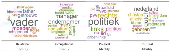 Furthermore, Figure 5 displays word cloud visualizations that represent the top fifteen most frequently occurring words for each social identity classification. To ensure clarity and focus on the relevant terms, default Dutch and English stop words defined in the R tm: Text Mining Package ‘stopwords’ library [64], were excluded from the analysis. Additionally, overlapping terms that exclusively pertained to other social identity categories were eliminated, taking into account the non-mutual exclusivity of the categories. Firstly, for relational identity the most common words include; ‘vader’ (father), ‘moeder’ (mother), ‘getrouwd’ (married), ‘father’ and ‘echtgenoot’ (spouse), among others. As such, this category most often employs words relating to immediate family. Next, for occupational identity the most common words include; ‘ondernemer’ (entrepreneur), ‘manager’, ‘MSc’, ‘consultant’ and ‘senior’, among others. As such, this category most often employs words relating to high-level education and white-collar professions. For political identity, the most common words include; ‘politiek’ (politics), ‘rechts’ (right), ‘links’ (left), ‘lid’ (member) and ‘politieke’ (political), among others. As such, this category most often employs words relating to general political interest, political orientation, and party memberships. Lastly, for cultural identity the most common words include; ‘Dutch’, ‘Nederland’ (The Netherlands), ‘geboren’ (born), ‘Christen’ (Christian), and ‘Atheïst’ (Atheist), among others. As such, this category most often employs words relating to the Dutch country or nationality, where one originates from, and religion.