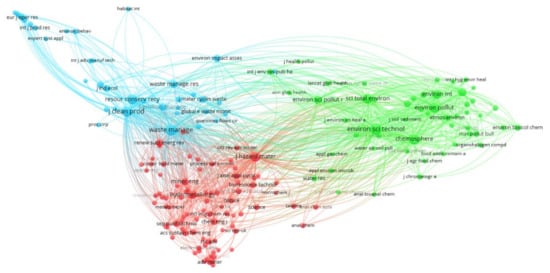 - Cluster 3 (in blue)—Research on recovery and recycling of used materials