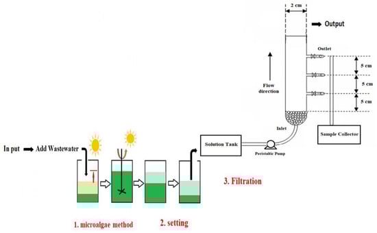 The microalgae were only added at the beginning of the study. The study was repeated three times to observe the effect of retention time and to understand how much time is needed for the microalgae to effectively maintain the system. The filtration method is recognized as one of the most cost-effective methods of harvesting microalgae [54]. For this reason, a large filter with a pore diameter in the range of 4.0 to 5.5 µm was used in this study to filter the effluent. A variation study of the post-treatment parameters was carried out under both pre-filtration and post-filtration conditions.