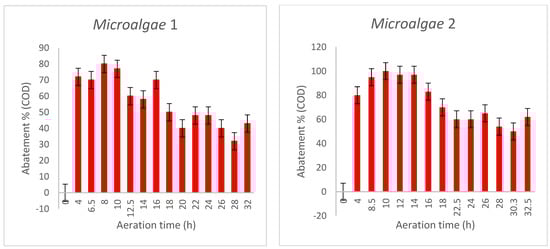 During the submerged phase, the COD decreases due to the high degree of acclimatization of life forms in modified conditions, and, in addition, a colloidal material of carbon can exist that is gradually biodegradable [71]. The growth of micro-organisms and biomass enabled COD to be removed through the development of biomass micro-organisms. At the same time, the oxygen supplied by algal photosynthesis could be used to break down organic matter in the raw effluent [72].