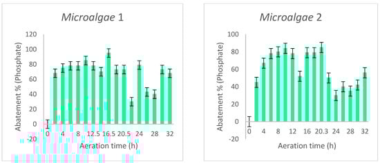 Phosphate is considered to be an intermediate in the conversion and synthesis of nucleic acids. This nutrient enters the microalgae cells by direct delivery to the plasma membrane as [22]. The phosphate removal in mg/L of the raw wastewater from both microalgae cultures is shown in Figure 3.