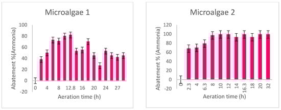 In the case of nutrients (ammonia), a variation in the reduction in ammonia was also observed on a six-monthly basis. A maximum reduction of 100%, which concerns the concentration of ammonia in the filtered effluent below the detectable limit, is observed only after 11 h of retention. This is shown in Figure 4.