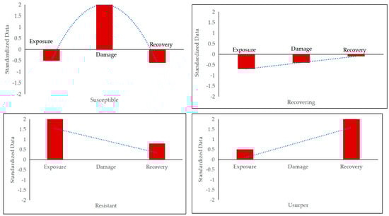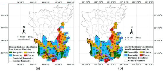 - The four coupling coordination states showed that 27 counties (cities) were classified as “Resistant”, which showed reduced losses after the disaster and recovered well, even after a high level of exposure. A total of 23 counties (cities) were classified as “Recovering”, which showed that the exposure level was high before the disaster, the unbalanced state could not be rapidly changed to the equilibrium state after the disaster, and the recovery period was relatively long. Eight counties (cities) were classified as “Susceptible”, showing that the carrier suffered from a high level of exposure before the disaster and could not fully recover by itself after the disaster. Seven counties (cities) were grouped into “Usurper”, showing that they could not only withstand disasters, but also presented broad prospects for sustainable development. The classification accuracy rate was 95.4%, indicating that disaster resilience was composed of multi-element capability. The accuracy of missing cross-validation was 93.4%, which confirmed the robustness of the model.