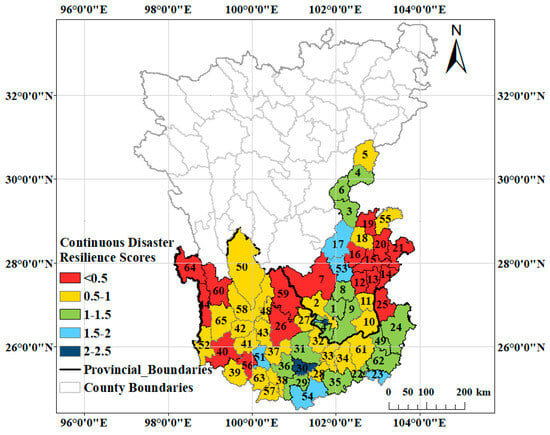 - The disaster resilience of 65 counties (cities) in the Hengduan Mountains with a high risk of geological disasters was evaluated, and the average score of continuous disaster resilience was 0.942, which was at a low resilience level. From the perspective of the number of counties (cities) with different disaster resilience levels, the number of counties (cities) with low resilience accounted for the majority, while the number of counties (cities) with high resilience accounted for a relatively small proportion, an “extreme” differentiation. From the perspective of spatial distribution, the distribution pattern was “high in the southeast and low in the northwest”. Those counties (cities) with high and medium–high resilience levels showed a “dot” distribution pattern, mainly distributed in the core areas with a gentle terrain, high population density, strong economic activity, complete infrastructure, and good ecological environment quality. The distribution pattern of medium resilience was “clumpy”, mainly distributed in the central and southeastern regions. Those counties (cities) with medium–low and low resilience levels showed a “marginal extension” pattern of distribution, mainly distributed in the transition zone between the Qinghai–Tibet and Yunnan Plateaus.