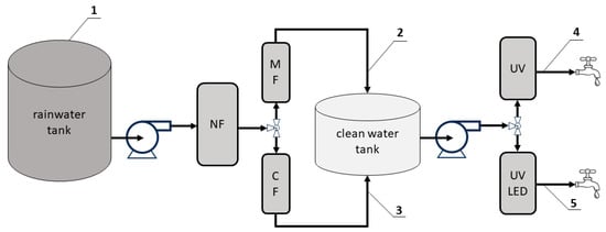 Experimental rainwater treatment system: NF—net filter; MF—membrane filter; CF—ceramic filter; UV—UV lamp; UV LED—UV LED radiator; 1 to 5—treated water sampling points.