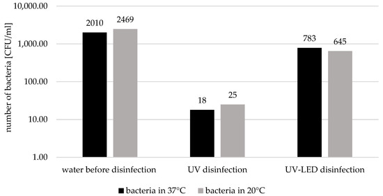 The total number of bacteria at 37 and 20 °C after both the use of a UV LED lamp and a mercury UV lamp was reduced from over 2000 CFU/mL to approximately 700 and 20 CFU/mL, respectively. After using a UV filament lamp, Escherichia coli and Enterococci were not detected.