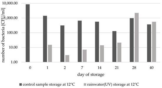 The population of coliform bacteria and Escherichia coli was also renewed, regardless of the rainwater storage temperature after the UV disinfection process (Table 7).