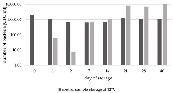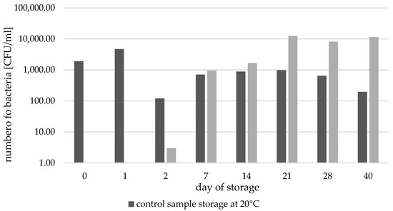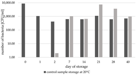 In a tank maintained at a temperature of 20 °C, rapid multiplication of the recreated bacterial microflora was recorded on the 7th day after UV disinfection. Bacteria at 22 °C renew 1–2 days after UV disinfection. On the 14th day of storage at 20 °C, their number reached over a thousand CFU/mL (Figure 6 and Figure 7).