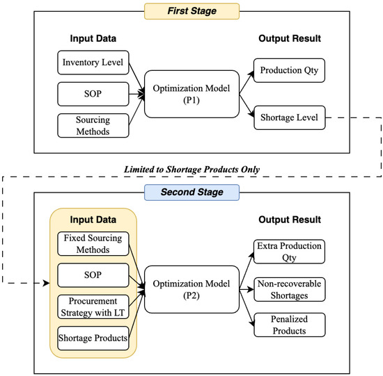 Figure 1 shows the concomitant structure of the overall framework with two-stages. As shown in the figure, the first stage calculates the production quantity and shortage quantity considering three data: Inventory Level, SOP and Sourcing Methods. In the second stage, the model optimizes the procurement strategy under the consideration of the shortage products only.