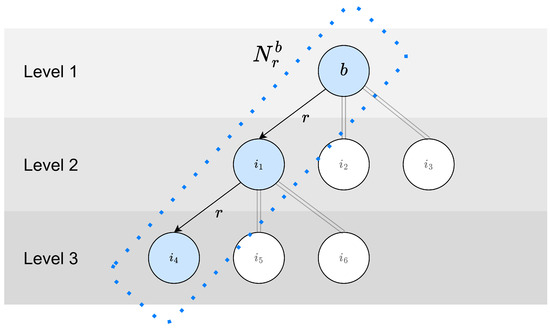 Within configuration b, each element is characterized by a hierarchical level. We utilize a depth first search to generate a branch r. The elements found within this branch then compose the set .