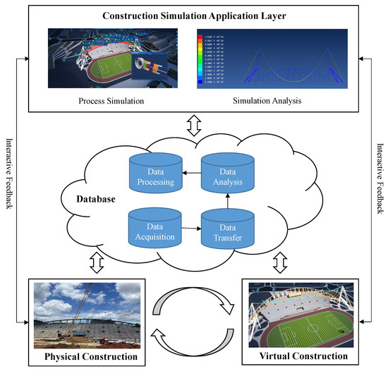 where mainly includes attribute data of physical construction elements in and dynamic process data reflecting construction conditions, mechanical properties of components, environmental parameters, etc., which can be collected by sensors and other IoT devices; mainly includes geometrical, physical, behavioral, and rule-based modeling data of ; mainly includes simulation and analysis data generated by the simulation system; includes constraint data such as standard specifications and knowledge and experience; and is the derivative data derived from the data preprocessing, correlation, fusion, and other related processes of , , , and .