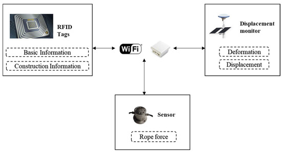 Sensor equipment collects mechanical response data from key components of the cable structure, facilitating the virtual-to-real mapping of the construction process. This involves inputting marking numbers, basic information, and construction details of these components onto RFID tags. Construction steps are dynamically updated as per on-site sequencing. Monitoring the cable structure’s cable force, deformation, and displacement is crucial. These data are actively monitored by the cable force sensor and the Beidou displacement monitor within the external traction device. Subsequently, this information is wirelessly or through wired means transmitted to the digital twin database. The mechanism for acquiring cable force, displacement, and deformation is illustrated in Figure 5.
