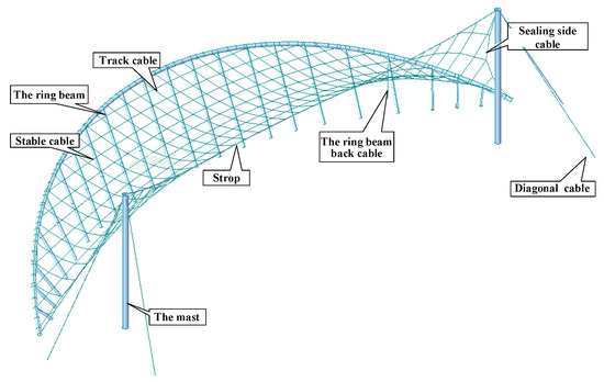 The roof structure of a stadium project located in Fujian Province, China, features a single-layer cable network roof with a rigid boundary on one side and flexible linear boundaries on three sides. The three-dimensional structure is depicted in Figure 8. Given the unique structural configuration of a single-layer cable network roof with open flexible boundaries, this project presents challenges such as intricate force transmission paths, notable nonlinearity, and intricate mast balancing during construction. To ensure the overall quality and safety throughout the construction phase, a thorough analysis of the cable structure construction process’s continuous dynamics is imperative. This project has been chosen as a case study to validate the effectiveness of the continuity dynamic analysis method based on the digital twin (DT) concept for cable structures. The approach involves the establishment of a DT model for the cable structure, the development of an intelligent simulation system rooted in the DT framework, and the subsequent execution of the continuity dynamic analysis across the cable structure’s construction phases.