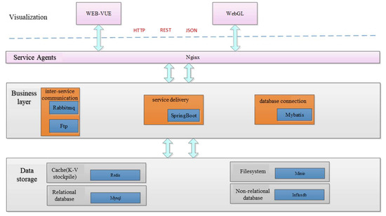 The monitoring data are transmitted to the backend through the Rabbitmq message queue service for data processing. The data storage business data are stored using Mysql primary and secondary storage. The file data are stored using Minio service. The monitoring data are stored using Influxdb. The data are orchestrated through Springboot architecture. The interface specification is developed through Rest specification. Nginx is used to proxy the service, and Vue + WebGL is used to visualize the page. The overall architecture design is shown in Figure 11.