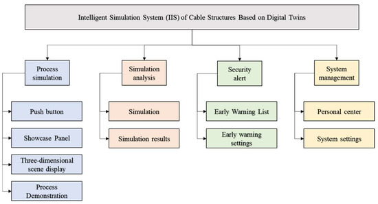 The validation results from case studies demonstrate the system’s accuracy. The maximum error in single-cable self-weight validation between the intelligent simulation system and Midas cable force is 5.71%. In cable network self-weight validation, the average error is approximately 5% (5.46% for 100 units and 4.95% for 10 units). In beam cable validation, the transverse cable force difference remains within ±1.7% or less. Additionally, continuous dynamic simulation calculations and real-time monitoring of mechanical responses confirm the feasibility of the proposed DT-based approach.
