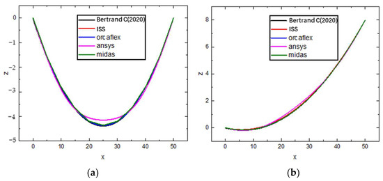 To further validate the effectiveness of the intelligent simulation system based on the DT, this study compares the analysis results of the system’s operational unit tests and beam–cable structures with commonly used finite element software. These comparisons are primarily divided into three segments: single-cable tests as shown in Figure 13, cable network tests as shown in Figure 14, and beam–cable structure tests as shown in Figure 15. For these models, the study conducts a comparison of the test results using Midas, Orcaflex, and Ansys, respectively. Furthermore, a comparison with the data from the literature is also undertaken as part of this study [38].