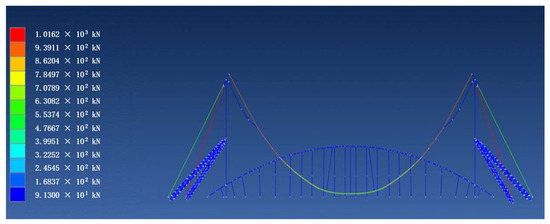 Since the process of lifting and tensioning of the cable structure is not fast, quasi-static can be used for the simulation during construction. During the construction process, for the lifting of the cable end points, the end points can be lifted by modifying the actual coordinate points of the end points. The tensioning of the cable (including the traction cable) can be performed by modifying the original length of the cable, modifying the in Equations (10) and (11) to tension the cable. For example, if the traction cable is tensioned from the original length to 0, gradually changes from the initial value to 0 in each construction step, and its value change process can be adjusted according to the actual tensioning process.