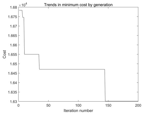 Utilizing an improved ant colony algorithm, the model was employed to address the task, resulting in the optimal collection and transportation scheme after 200 iterative cycles. The convergence process of the algorithm and the best collecting and transporting path are shown in Figure 4 and Figure 5. Among them, the total distance traveled by vehicles was 98.86 km, the total cost was 2488.91 CNY, and the vehicle configuration was set for five vehicles.