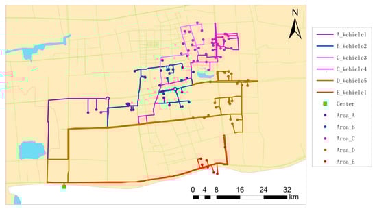 The specific collection and transportation order for each area is presented in Table 5. From the table, it can be seen that the waste collection and transportation work of Area A–E was completed by five vehicles, numbered 1–5. Comprehensively considering the cost of collection and transportation, driving distance, and running time, it was arranged for the No. 1 vehicle to complete the collection and transportation of the eight waste collection points in Area A and then depart from the sanitation base to Area E for collection and transportation. Area C required the No. 3 vehicle and No. 4 vehicle to work at the same time and complete the delivery within the specified working hours.
