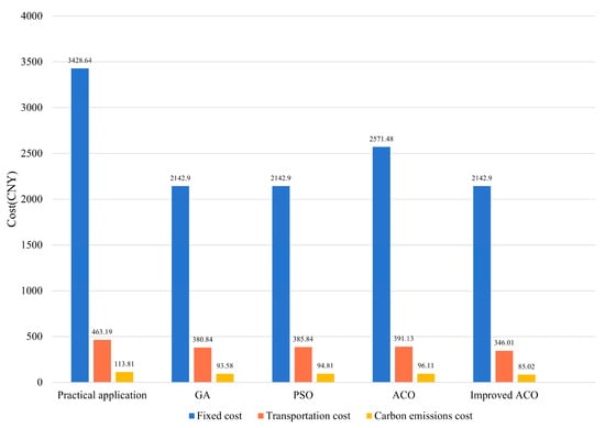 In summary, the improved ant colony algorithm based on spatial dynamic clustering yields the optimal waste collection and transportation solution with the lowest total cost of 2573.93 CNY. The total cost was reduced by 31.2, 1.66, and 1.89% compared to that of the actual collection and transportation scheme, the GA scheme and the PSO scheme, respectively.