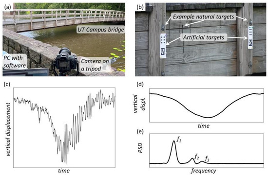 Figure 4 shows the application of a CV-based SHM system for monitoring structural response and traffic on the University of Twente (UT) Campus bridge [71]. The system consists of two cameras: (1) a traffic camera (its field-of-view is shown in Figure 4a; and (2) a monitoring camera for measuring bridge response. The monitoring camera has a zoom lens to capture small bridge deformations. Within its field-of-view both artificial targets (which have known dimensions) and natural targets (such as bolts and knots in timber elements) can be seen, as shown in Figure 4b. Figure 4c plots raw (i.e., not pre-processed for measurement noise) vertical displacements of a target (from Figure 4b) during a single pedestrian crossing. Figure 4d,e plot the unit influence line induced by the moving load and power spectral density (PSD), respectively. The influence line can be used to characterize the load and response mechanism and assess the performance of the bridge when the known load is used as the moving load. The PSD plot shows the first few bridge frequencies, which can also be used to characterize the dynamic response of the bridge.
