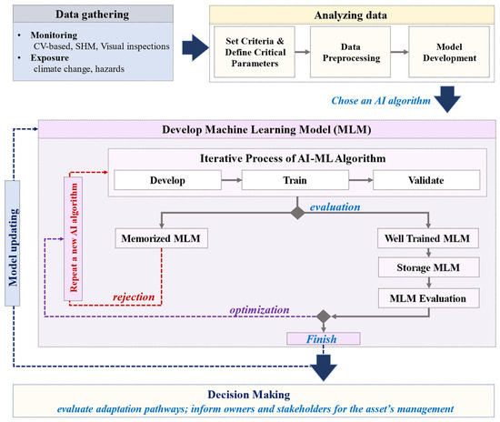 Artificial intelligence (AI) and machine learning (ML) support the analysis of SHM data. The machine learning model (MLM) is a trained computer system that generates data, makes accurate predictions, and can identify errors or fault measurements and update [61,66,72,73,74,75]. The algorithms are selected to minimize data-processing time and errors and provide efficiency. Many AI methods, such as fuzzy logic, neural networks and autoregressive models, find applications in structural engineering since they assist in the condition assessment of an asset by: (i) identifying the critical parameters; (ii) making reliability analysis; (iii) identifying load patterns or extreme loads on structures (e.g., traffic load, extreme temperature, wind, or snow); (iv) making load-effect analysis; (v) early warning assisting in decision making; and (vi) recognizing fault measurements of sensors [72,73,75,76]. MLMs are developed based on one of three categories: (1) supervised learning (e.g., classification or regression); (2) unsupervised learning (e.g., clustering); and (3) reinforcement learning [75,77,78] and criteria and thresholds defined by expert judgments and codes.