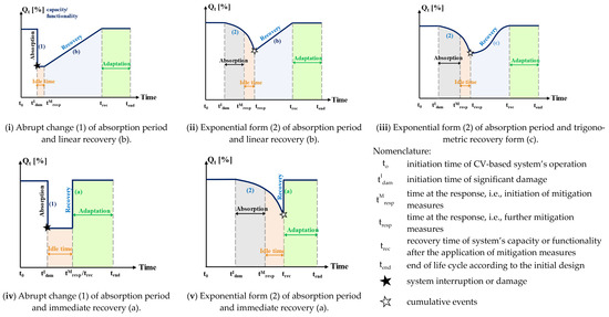 Possible events relevant to these kinds of curves would be the need for system upgrading due to the decaying of wiring or cables (Figure 6(ii)) and damage to the system’s components due to environmental exposure and conditions such as high winds, heavy rain, and dense fog (Figure 6(iii)). Additionally, the recovery period, depending on the mitigation strategy, follows either: (a) a steep form (immediate recovery); (b) a linear; or (c) a trigonometric form, resulting in adapting the system to both hardware and software in future time. The different forms of recovery period are described extensively and are matched with the various events, exposure conditions, and time in Figure 6 and Table 1.