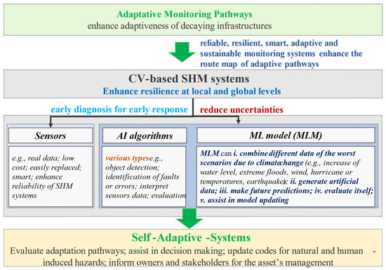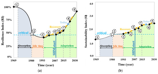 Socio-economic criteria corresponding to sustainability demands are also considered. In line with this, the maintenance of structures for their recovery and adaptation, along with limitations derived from the safety, functionality, or environmental demands, are essential for the decision-making process. Resources are strongly correlated with the cost of the available mitigation measures that can be adopted [55,56], affecting also the flexibility of the AP. For instance, adaptation is limited if resources are lacking. Therefore, investment is essential for meeting the targeted levels and is considered one of the resilience components. Modern needs also include CTI operations, usually based on technological advancement, and contribute drastically to adaptation. For the AP method considered herein, the resilience index (Section 2.3.1) and sustainability index (Section 2.3.2) are computed using the inflow of SHM data throughout the asset’s lifetime, setting the ground for AI predictions of plausible pathways.