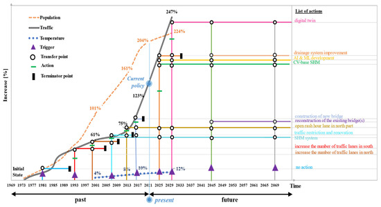 For the proposed method, the decision points are synchronized; thus, a specific event (such as an increase in population or traffic, a flood event, etc.) induces monitoring-data-updated analysis, and the performance is studied to suggest mitigation measures and more-adequate actions for the installation of monitoring systems. The decision points can depict existing actions (i.e., based on the history of the studied asset, city, etc.) or illustrate plausible actions (i.e., scheduled to be carried out in the future).