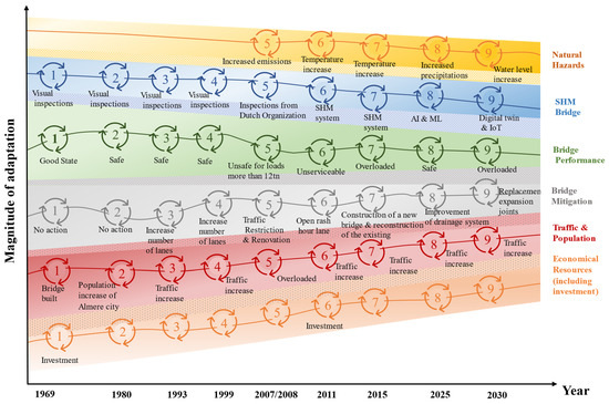 In this study (detailed in Section 4 and Section 5), all pillars of sustainability are considered, including: (1) the environment through climate change; (2) society through population and traffic increases; and (3) the economy through the resources allocated to the infrastructure project. Aiming to enhance APs’ qualitative assessment, resilience and sustainability indices are combined with structural and monitoring data. Assisted by emerging technologies of AI that help to increase reliability, the policy followed under the occurrence of new events is updated. The progressive change in the AP demonstrates the flexibility to adapt.