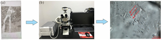 Fluid inclusion test process. (a) Preparation of fluid inclusion samples. (b) Instruments for observation and temperature measurement of fluid inclusions made in Linkam Scientific Instruments Limited in Salfords, UK. (c) Observation results and acquisition of homogenization temperature of fluid inclusions.