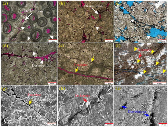 Characteristics of natural fractures in thin sections and SEM. (a) Intra-grain pores and dissolved tectonic fracture, well PG104, 5784.05 m, thin section with red casting. (b) Dissolved tectonic fracture is partially filled with bitumen, well PG104, 5796.48 m, thin section with red casting. (c) Connected dissolution pores form dissolution fracture, well PG304, 5555.42 m, thin section with blue casting. (d) Tectonic fracture expands dissolution pores, well PG104, 5793.4 m, thin section with red casting. (e) Two nearly parallel dissolved tectonic fractures, well PG104, 5672.13 m, thin section with red casting. (f) Multiple tectonic fractures form fracture networks, well P1, 3429.62 m, thin section with blue casting. (g) Tectonic micro-fractures, well PG104, 56,709.02 m. (h) Dolomite-filled tectonic micro-fracture, well PG104, 56,716.13 m. (i) Two sets of dissolved tectonic micro-fractures, well PG104, 56716.15 m.