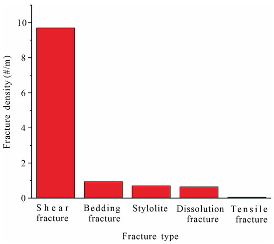 The fractures observed in the study area predominantly consist of shear fractures. Notable variations exist in fracture density among different types of natural fractures (Figure 6). A statistical analysis of shear fracture density based on core samples and image logs found that the average fracture density can reach 9.7 m−1. Conversely, the average density of tensile fractures is a mere 0.05 m−1. Additionally, the average fracture density for bedding fractures is 0.94 m−1 and for stylolites it is 0.7 m−1. Dissolution fractures exhibit a relatively lower density at 0.65 m−1. Consequently, this study primarily concentrates on the statistical analysis of the strike, dip angle, and filling conditions of tectonic shear fractures.