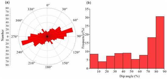 Based on their dip angle, fractures in the Feixianguan Formation can be classified into five categories: near-vertical fractures (>80°), high-angle fractures (60–80°), medium-angle fractures (30–60°), low-angle fractures (10–30°), and near-horizontal fractures (<10°). The majority of fractures, accounting for 52% of the total, exhibit dip angles in the range of 60–90°. Medium-angle fractures (30–60°) comprise approximately 25% of the fractures. Low-angle fractures (10–30°) and near-horizontal fractures (<10°) account for the remaining 23% (Figure 7b).