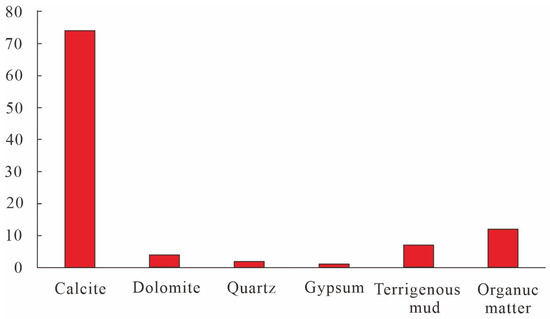 The statistical analysis of the fill ratio of shear fractures revealed that 60% of the fractures were unfilled, while the remaining 40% were filled. The fractures in the study area were filled with various materials (Figure 8). Calcite was the dominant filling material among the fractures, accounting for 74%. Other filling materials included bitumen organic matter, terrigenous mud, dolomite, quartz, and gypsum (Figure 8). It is worth noting that some fractures exhibited multiple filling materials. For instance, in a calcite-filled fracture, the calcite and fracture wall edges were contaminated by bitumen (Figure 9a).