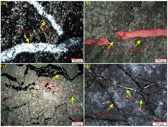 The fracture filled with clean calcite terminates in the fracture filled with bitumen, suggesting that the formation of clean calcite occurred after the formation of the bitumen-filled fracture (Figure 9c,d). The unfilled fractures intersect with the clean calcite veins (Figure 9b), indicating that these unfilled fractures were formed after the late-stage clean calcite filling. At least three periods of tectonic fractures were identified in this study by analyzing fracture-filling characteristics and cross-cutting relationships.