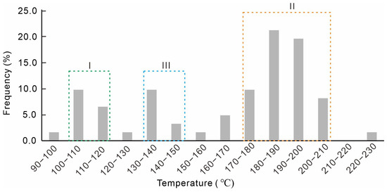 A histogram of the homogenization temperatures of inclusions in calcite veins (N = 72). I represents the Stage I fractures. II represents the Stage II fractures. III represents the Stage III fractures.