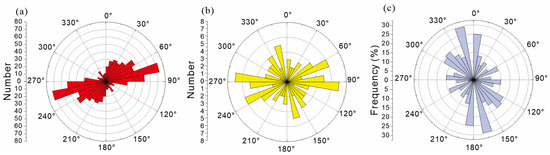 Filling degree of tectonic fractures with different strikes. (a) Strike rose diagram of unfilled tectonic fractures obtained from borehole image logs (N = 466). (b) Strike rose diagram of mineral-filled fractures obtained from image logs (N = 55). (c) Proportion of filling fractures with different strikes obtained from image logs (N = 521).