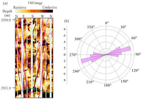 The Feixianguan Formation in the study area exhibits extensive development of shear fractures, commonly occurring in clusters. Analysis of these fractures using image logs shows various strike directions, including NEE–SWW, NW–SE, NE–SW, and near E–W orientations. The NEE–SWW direction is the most prevalent (Figure 7a).