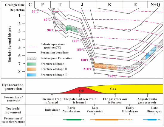 According to the burial history and petroleum accumulation model of the Feixianguan Formation, the initial fractures (stage I) originated during the Middle Triassic period, specifically from the late Indosinian to early Yanshanian periods (Figure 13). It is worth noting that many of these fractures were filled with minerals such as calcite (Figure 9a). These fractures either pre-date or were formed contemporaneously with the petroleum accumulation period. Intense tectonic activities, as documented by Li et al. (2021) [35], occurred during the late Yanshanian period, leading to the formation of stage II fractures (Figure 13). These fractures provided storage space for oil and gas and facilitated the migration of hydrocarbons and other diagenetic fluids. Subsequently, during the Himalayan period, changes in the tectonic stress field led to the development of a series of NE–SW and nearly E–W-striking fractures (stage III) within the reservoir rocks (Figure 13). In conjunction with the pre-existing fractures, these fractures interconnected and intersected, forming an open and connected fracture network within the reservoir (Figure 5f). This fracture network played a crucial role in enhancing the productivity of carbonate oil and gas reservoirs. It is noteworthy that the filling degree of the fractures formed during the Himalayan period was relatively low. These fractures, coinciding with the uplift and degassing phase of the oil and gas deposits, served as migration pathways for oil and gas and provided storage space for natural gas. The presence of residual bitumen in the carbonate fractures of the Feixianguan Formation, as observed in the thin sections, further supports this perspective (Figure 9a,c).