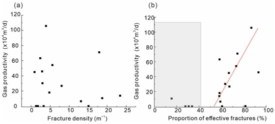 The influence of fracture density and proportion of effective fracture on oil and gas production in the Feixianguan Formation of the study area. (a) Correlation between fracture density and gas production: the data were obtained from 17 wells. (b) Correlation between the proportion of effective fractures and gas production: the data were obtained from 17 wells. The grey area represents effective fractures have no obvious correlation with natural gas productivity. The red dashed line indicates that effective fractures have a good correlation with natural gas productivity.
