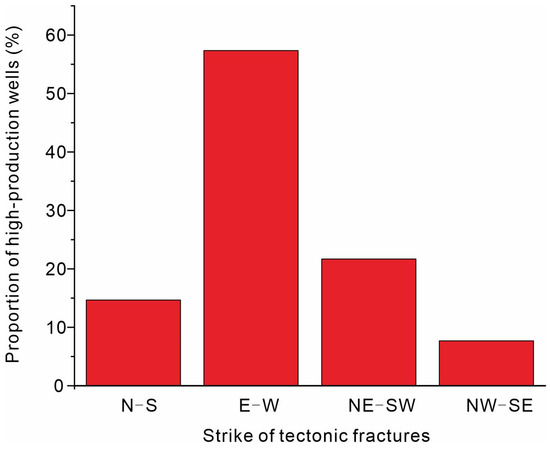 A comparative analysis of fracture orientations from high-yielding and low-yielding wells reveals that fractures oriented in the NE–SW and NEE–SWW directions yield higher single-well natural gas production. Conversely, natural fracture production is low in the near N–S and NW–SE directions. This finding suggests that fractures oriented in the NE–SW and NEE–SWW directions are more effective in gas production (Figure 15). Mineral-filled fractures striking the NEE–SWW and NE–SW directions exhibit significant characteristics, although they account for a low proportion of the total fractures. These fractures, nearly parallel to the in situ stress of NEE–SWW, have larger apertures and are more effective than fractures with other strike directions. In the study area, the NE–SW- and NEE–SWW-striking fractures with relatively good effectiveness play a crucial role in the high single-well natural gas production. This suggests that these fractures intersect with the current in situ stress at a small angle and can enhance gas production in the study area (Figure 15).
