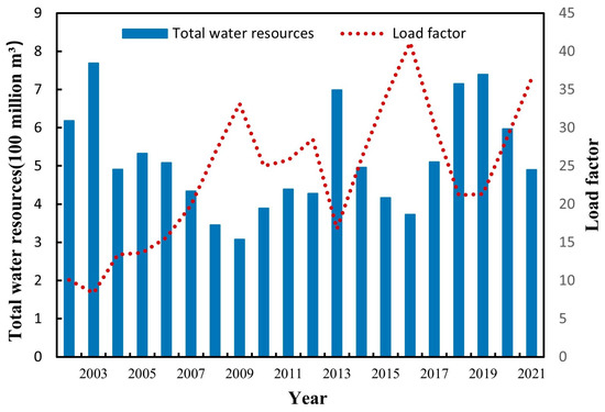 Between 2002 and 2021, Guyuan City’s population experienced a decrease of 7.339 × 105 people, translating to an average annual decline rate of 3.67%. In contrast, the local economy exhibited robust growth, registering an impressive average annual expansion rate of 17.47% over these two decades. During this time frame, water resources within the region remained relatively stable in terms of total volume, albeit with some fluctuations. Over the course of these 20 years, the peak total water resources reached 7.69 × 109 m3, while the lowest recorded figure stood at 3.08 × 109 m3. Combining the data from Table 2 and Figure 2, it becomes evident that Guyuan City experienced its highest water resource load factor in 2016, within the timeframe spanning from 2002 to 2021. This increase in the water resource load index can be attributed to a concurrent decline in water resources and a significant rise in GDP during that period. After 2016, the implementation of water-saving irrigation technology and efficient management systems initiated a decline in the water resource load index within the region. Nevertheless, the years 2020 and 2021 witnessed a noteworthy reduction in precipitation, resulting in a sharp decline in total water resources, and subsequently causing an increase in the load index. Moreover, despite the growth in GDP and a slight decrease in the permanent population, Guyuan City’s load index remained consistently high. This persistence can be attributed not only to the inherent water resource scarcity, but also to its intricate connection with economic development and urbanization.