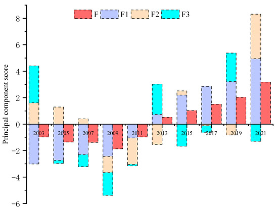 According to the results presented in Table 5, the first principal component exhibits positive correlations with urban GDP (X2), fixed asset investment (X3), per capita disposable income of urban residents (X4), per capita net income of farmers (X5), per capita water consumption (X8), household water consumption (X9), and industrial water consumption (X11). Conversely, it displays a negative correlation with year-end total population (X1) and water consumption per 10,000 Yuan of GDP (X12). These relationships primarily illustrate the influence of population dynamics and the level of socio-economic development on water resource development, utilization, and quality. The second principal component demonstrates positive correlations with water supply (X7) and agricultural water consumption (X10), highlighting its connection to water resource utilization and supply–demand balance factors. The third principal component exhibits positive correlations with water resource quantity (X6) and annual average precipitation (X13), primarily reflecting the natural endowment factors related to water resources. These three major principal components encompass various factors, including population dynamics, economic development, water resource utilization, and the natural endowment of water resources. Together, they offer a comprehensive understanding of the driving forces behind changes in water resource carrying capacity. Consequently, these three principal components are employed to analyze the temporal trends in water resource carrying capacity in Guyuan City. Table 6 illustrates the comprehensive scores of water resource carrying capacity in Guyuan City spanning from 2002 to 2021. F1, F2, and F3 signify the scores of principal components, and the overarching score of principal components is denoted as F.