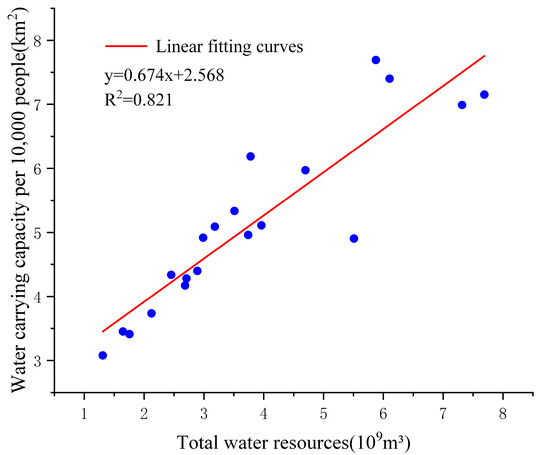 Figure 4 displays a linear regression plot depicting the relationship between water resource carrying capacity per ten thousand people and total water resources. This analysis utilizes the linear fitting method to assess the correlation between water resource carrying capacity per ten thousand people and the total water resources. It is clear that in cases of abundant total water resources, the water resource carrying capacity is high, while conversely, in situations with limited total water resources, the carrying capacity decreases. For instance, in 2003, when total water resources peaked at 7.691 × 109 m3, the per capita water resource carrying capacity was relatively high, at 5.87 km2/ten thousand people. Conversely, in 2009, with the lowest total water resources recorded at 3.078 × 109 m3, the per capita water resource carrying capacity reached its lowest point at 1.31 km2/ten thousand people.